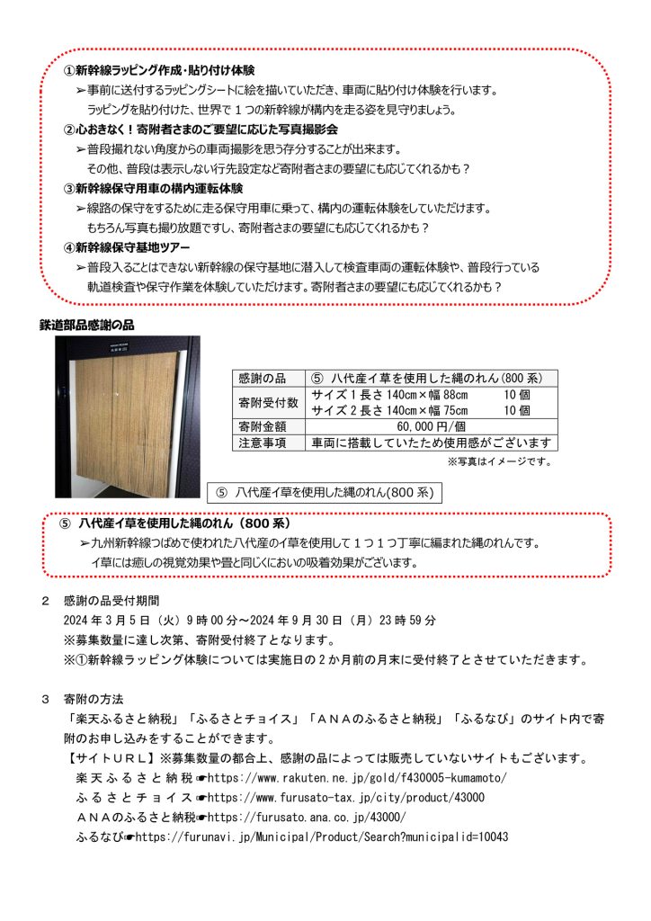 【プレスリリース資料】ふるさと納税でくまもとを元気に!九州新幹線の特別コト体験&鉄道部品感謝の品提供について